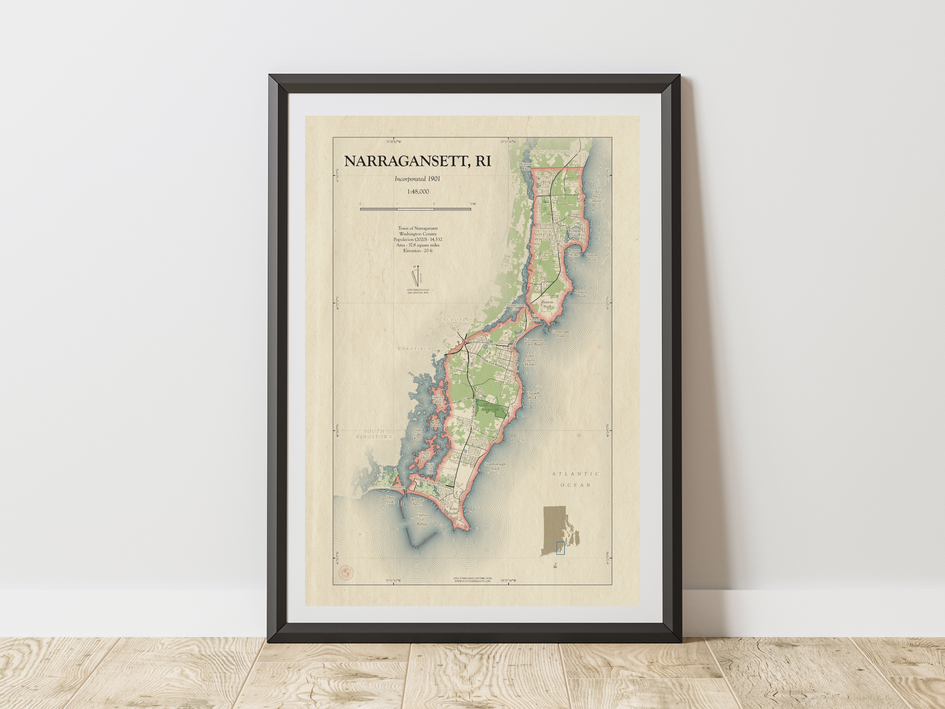 Narragansett Rhode Island Map Art Print HOMETOWN Style